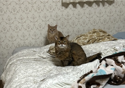そま吉さんとスコッチ。ご飯前。飼主食事。(減量指令が医者から出ています。)猫たちもあきれています。···